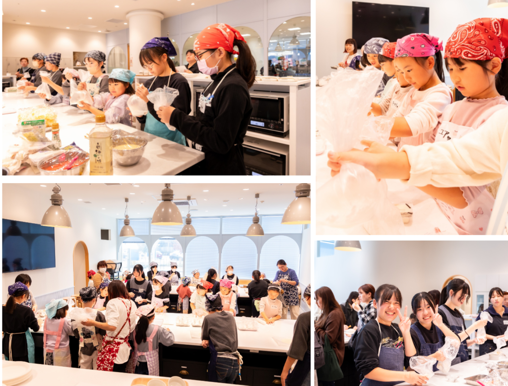 子供たちがシェフになってのピザ作り、ゴールドウインの残反を活用したモノ作り、みんなでひとつになってロングロングロールケーキ巻き、